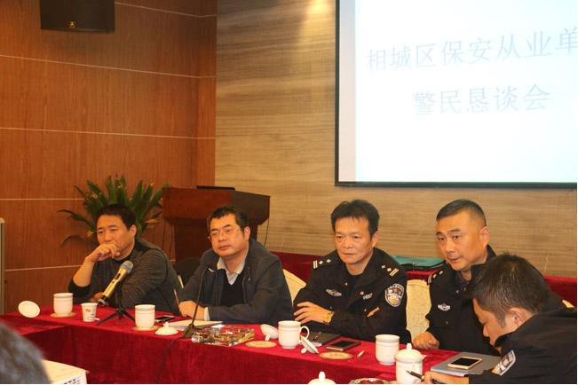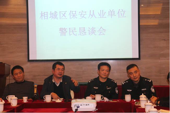2015年11月19日14:30在江蘇康平保安公司會(huì)議室舉行:相城區(qū)保安從業(yè)單位警民懇談會(huì),與會(huì)的有市公安局治安支隊(duì)保安監(jiān)管大隊(duì)的朱大、戴大,公安相城分局治安大隊(duì)的楊大、賀大、吳警官,還有相城區(qū)各保安行業(yè)的企業(yè),通過(guò)懇談會(huì),深刻領(lǐng)悟市局、分局領(lǐng)導(dǎo)有關(guān)指示精神!今年10月—12月省公安廳開展保安市場(chǎng)專項(xiàng)整治活動(dòng),公司積極做好:治安信息員、法制宣傳員、義務(wù)巡邏隊(duì)員工作,爭(zhēng)取完成省公安廳要求2016年6月底前所有在崗保安員必須持證上崗的指示,向兄弟單位學(xué)習(xí),不斷完善服務(wù)質(zhì)量,提高公司核心競(jìng)爭(zhēng)力,走品牌化道路的戰(zhàn)略目標(biāo)前行!